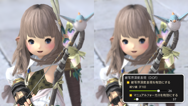 OFFのときはアップにするとキャラの顔にピントが合いますが、フォーカス位置を調整して武器の飾り(ブルーバード♪)にピントを合わせました。